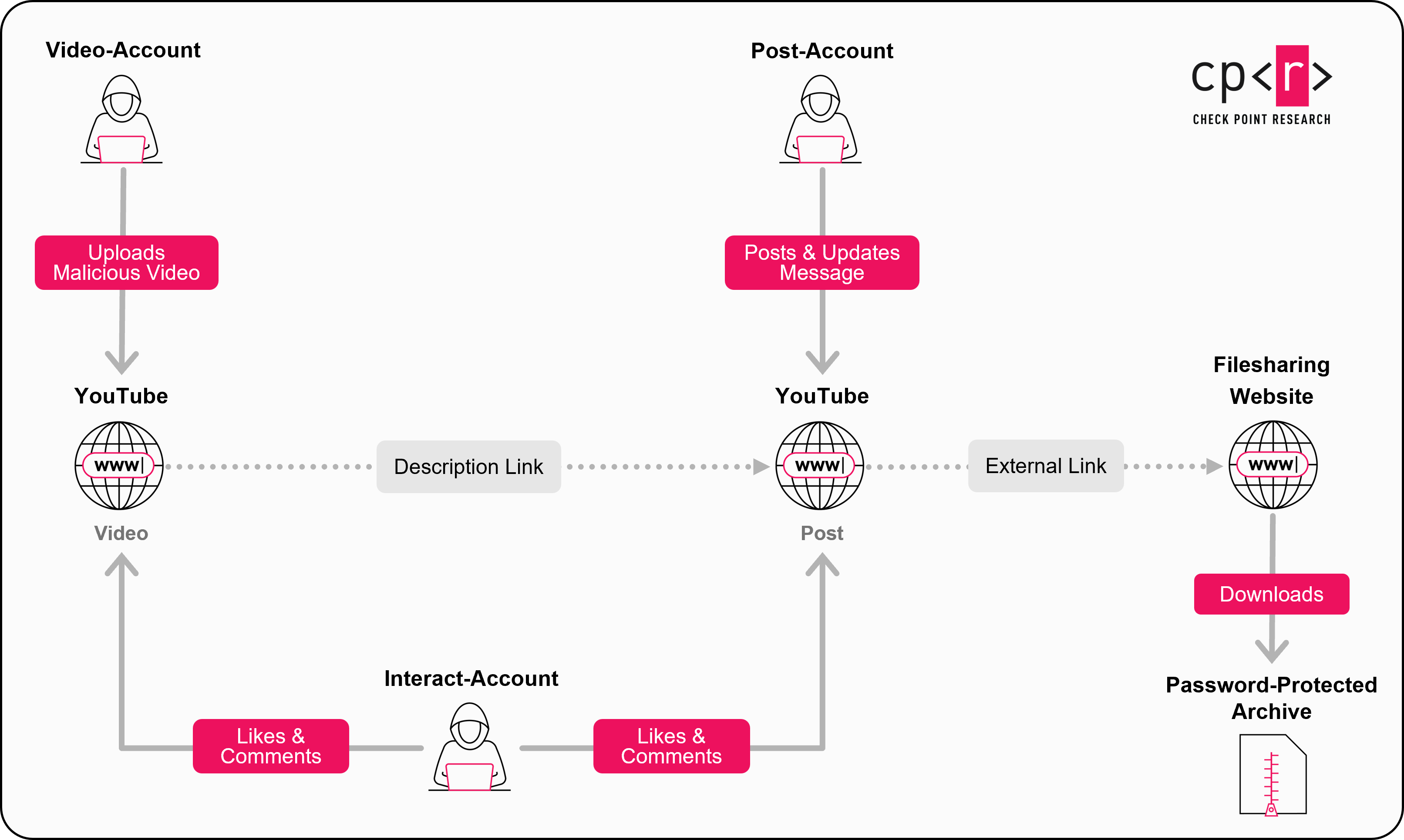 Die Operation stützte sich auf geknackte Software und Game-Hack-Videos, um Opfer zum Herunterladen passwortgeschützter Archive mit Malware zu verleiten. Dabei wurden gekaperte Konten verwendet, um Videos zu posten, Links zu teilen und Kommentarbereiche mit gefälschten Empfehlungen zu überschwemmen, wodurch ein falsches Gefühl des Vertrauens geschaffen wurde.